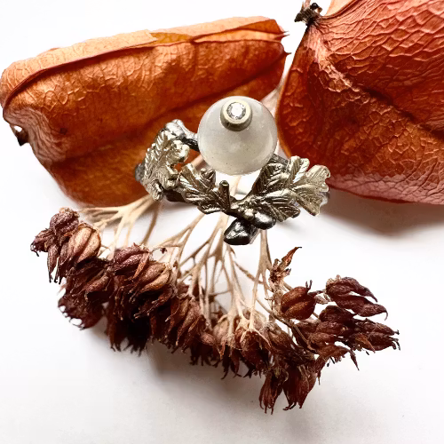 A beautifully detailed ring with golden leaf that accentuates the shape of the berry.