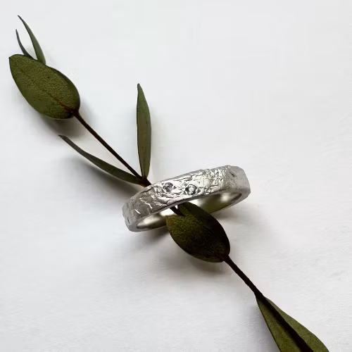 Med en struktur av klippor där det hårda får möta det vackra. Kontraster mellan en rå struktur och gnistrande safirer.